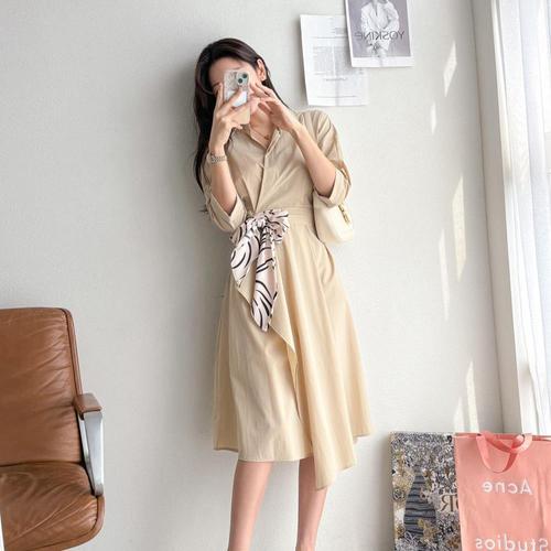 [옷자락] [시즌오프]랩스타일 리본 a라인 셔츠핏 바스락 칠부 원피스_5