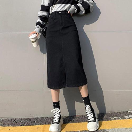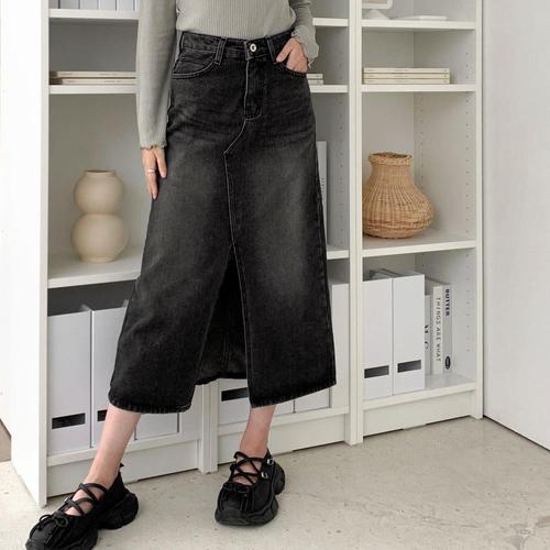 흑 여자 앞트임 청치마 데님치마 A라인 블랙 롱스커트 (HSJ-WCED56E)