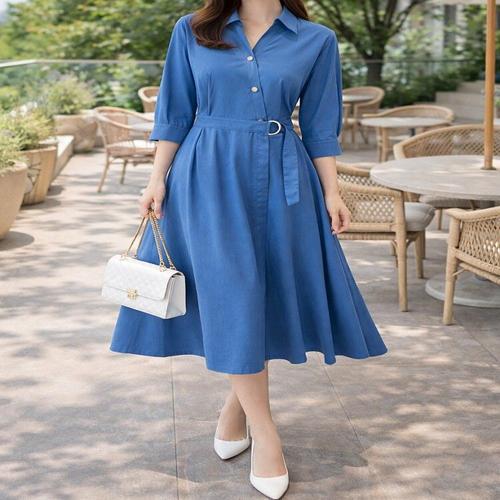 [꼼빠니아]여성 봄여름 7부 블루 벨티드 롱 원피스 CAEU3-WOP050