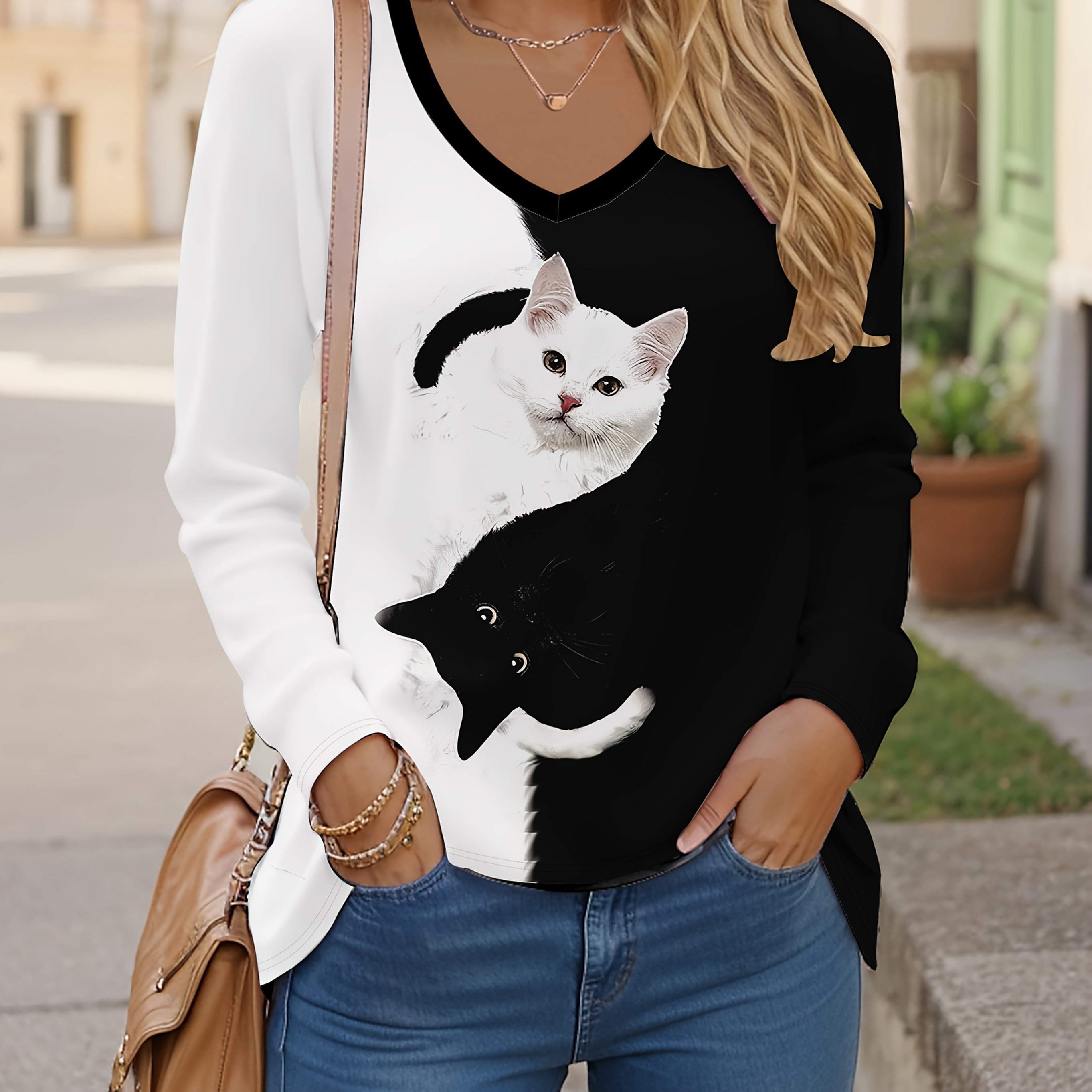 TEMU 여성 캐주얼 우아한 블랙 앤 화이트 고양이 패턴 V넥 긴팔 티셔츠