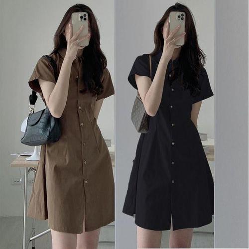 [에이치플러스몰]여자 단정한 A라인 셔츠 핀턱 카라 반팔 원피스 2컬러