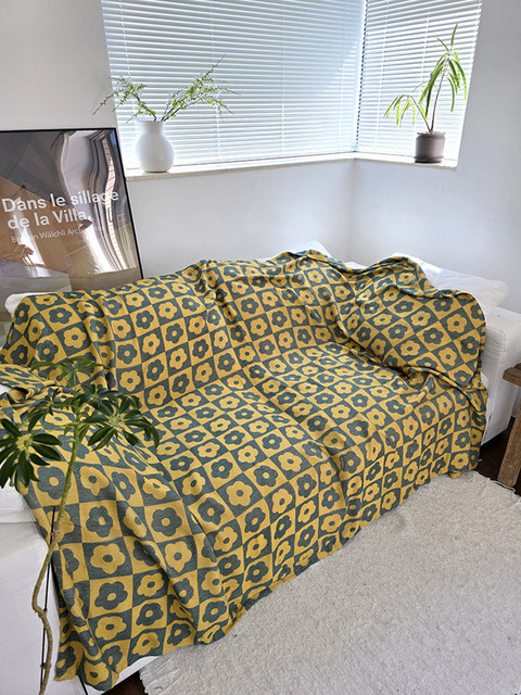 [블랑쉬하우스] 옐로우 플라워 체크 거즈 블랭킷 겸 이불 소파커버