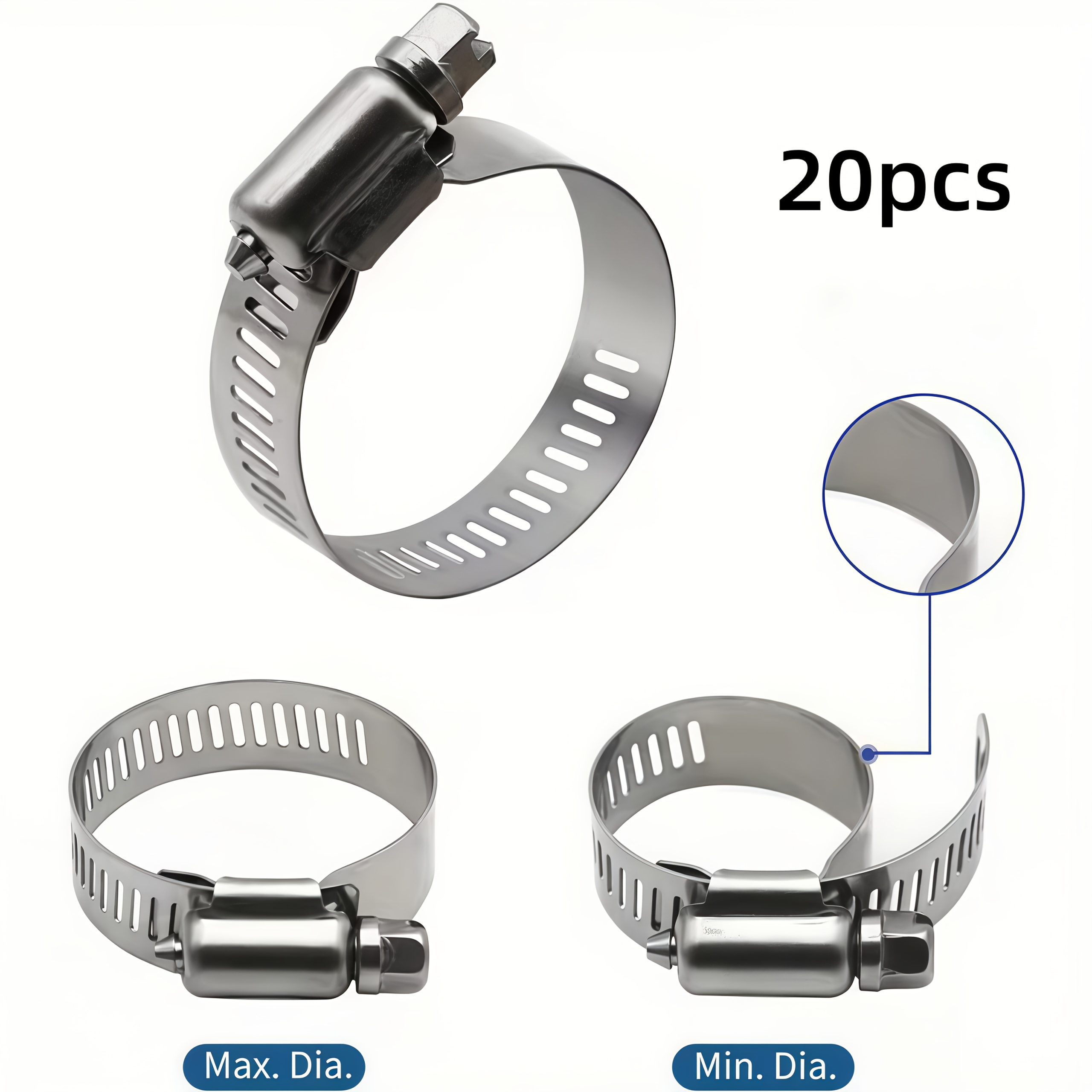 TEMU 20개 스테인리스 스틸 호스 클램프 키트, 웜 기어 조절 범위 1/4인치 - 1인치 (6-25mm), 배관, 인터쿨러, 덕트, 튜브 및 연료 라인용 내구성 강한 금속 파이프 클램프
