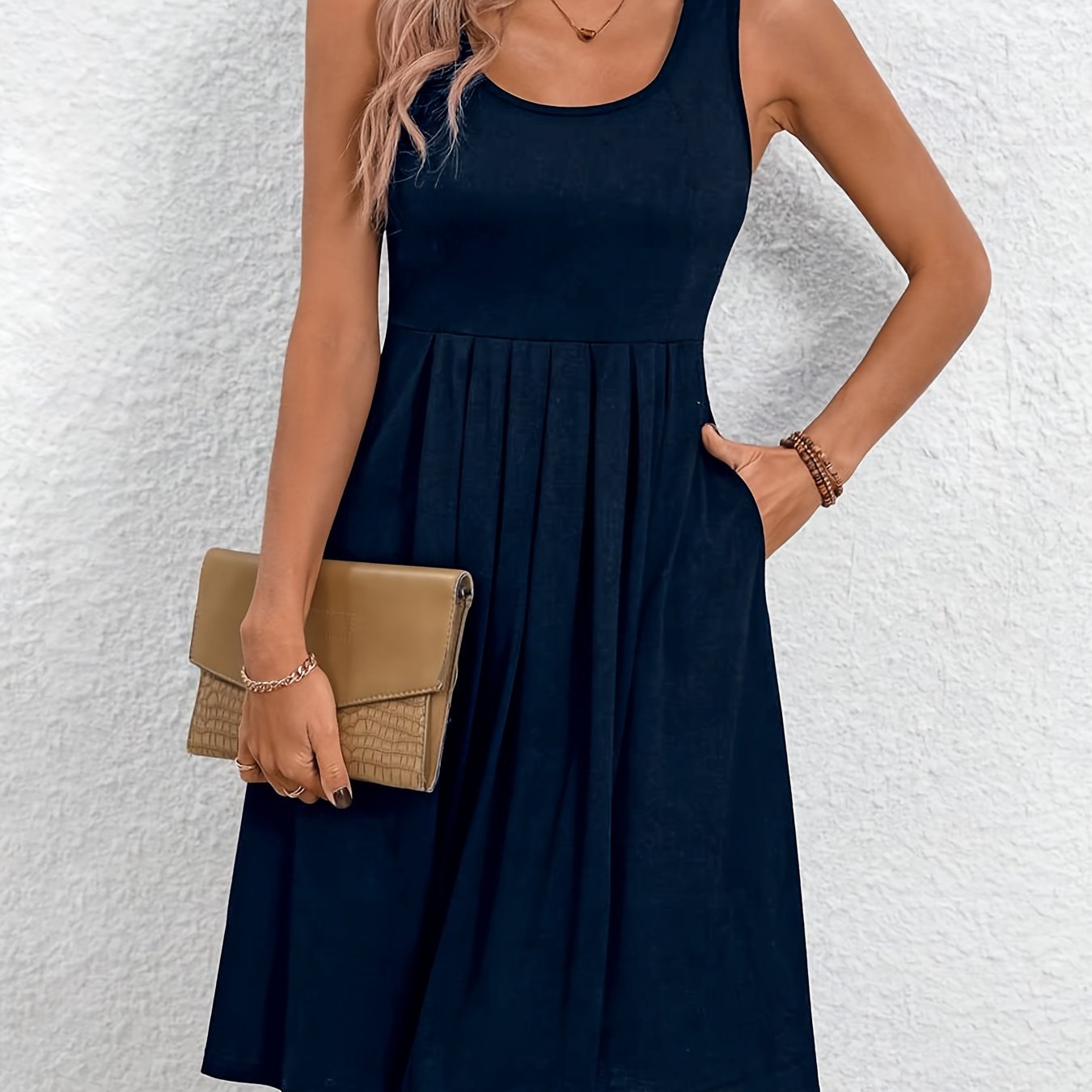 TEMU 단색 컬러 크루넥 탱크 드레스, 캐주얼 슬리브리스 러칭 포켓 드레스 봄 & 여름, 여성 의류