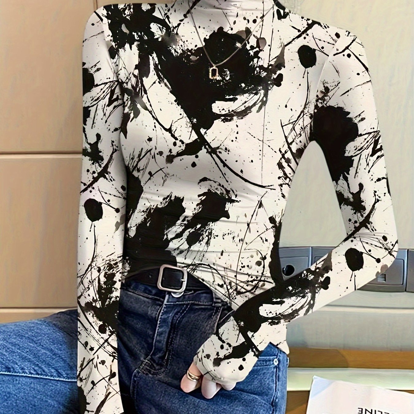 TEMU 여성용 우아한 수묵화 프린트 하이넥 긴팔 티셔츠, 다용도 편안한 캐주얼웨어, 사계절 패션