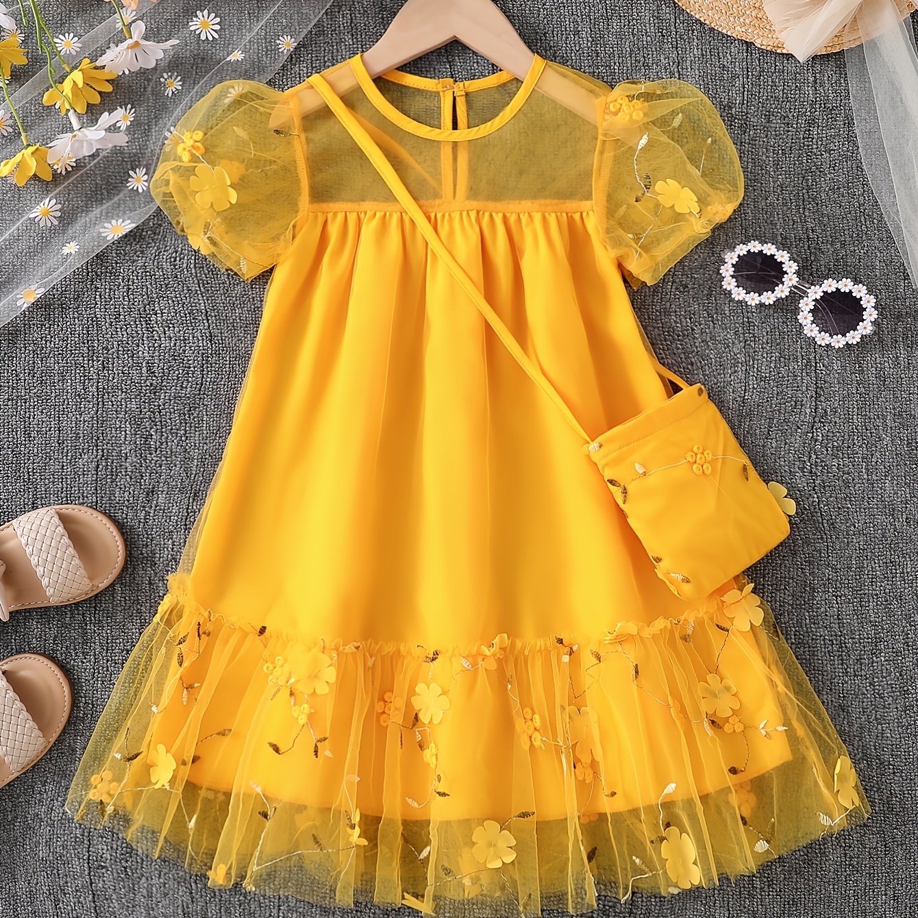 TEMU 여름 여아용 패셔너블한 플러프 소매 플로럴 패턴 원피스, 크로스바디 백과 함께 매치. 편안하고 다재다능한 데일리룩으로, 통기성 좋은 디자인으로 야외 활동에 적합합니다.