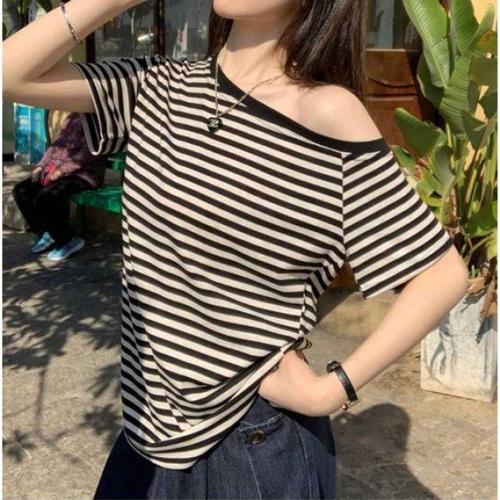 오프숄더 티셔츠 스트라이프 단가라 반팔 반팔티 상의 WFLLNVV