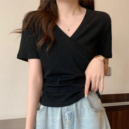 셔링 랩 반팔티 무지 V넥 스판 티셔츠 봄 여름 데일리룩